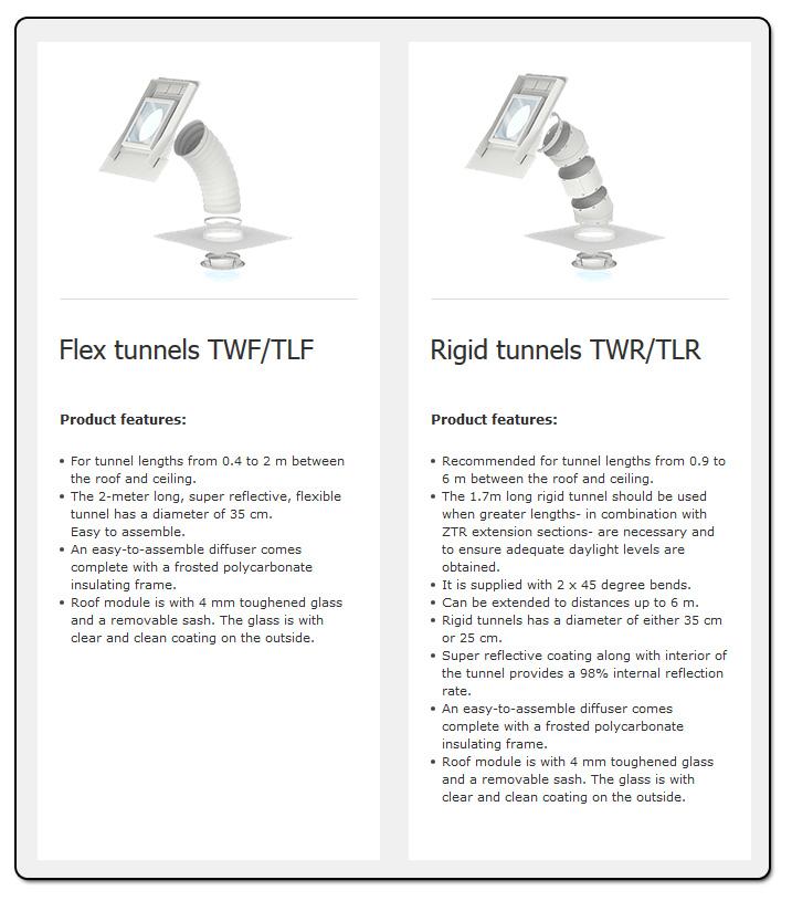 A VELUX sun tunnel can be installed in tiled roofs (TWF/TWR) or slated roofs (TLF/TLR). Sun tunnels for pitched roofs can be installed in roofs with 15- 60 pitches, for flat roofs youll need a sun tunnel for flat roof.